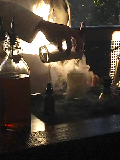 The evening started with some socializing in one of the fancy ballrooms at the Ebell and in the garden outside, featuring show-themed cocktails and bow-tied servers handing out cold crab claws, mashed potato & caviar shooters, duck bao buns, popcorn balls dipped in liquid nitrogen, and chicken liver pate on a stick encased in cotton candy. (I know, WHUT?)