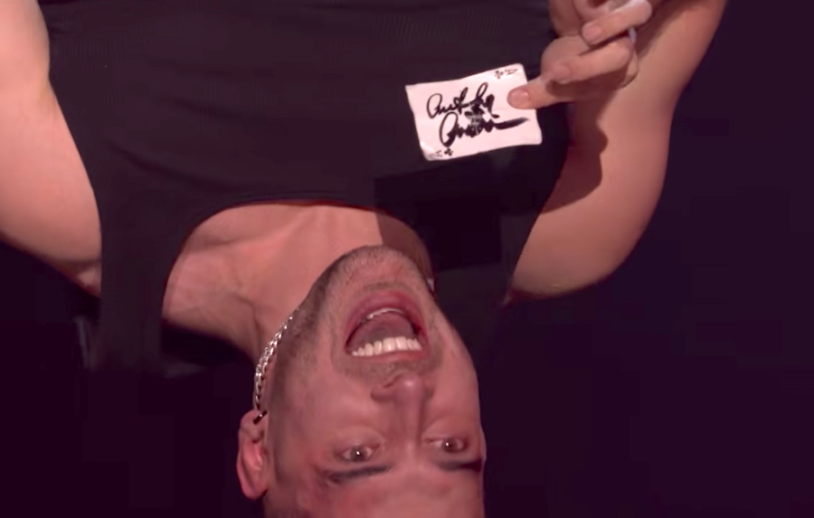 This week, magician and mentalist TJ Salta performed his riskiest act yet, executing what he called "the world’s most dangerous card trick". For his act, he had host Anthony Anderson sign a card, which he then had one minute to find after putting it back into the deck. Simple, right? Except he had to do it all while in a straitjacket and dangling upside-down from a "triangle of death" that had been set on fire! His trick was so impressive that he received 5 stars from every judge in addition to earning the competition’s highest score so far, with a total of 4.68 stars.