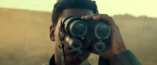 As his voiceover continues, we see a shot of Finn himself, looking at something through binoculars. He seems to be in the same lush, green planet as Rey, and immediately following this shot, we see Rey continue to sprint across the landscape. Is Finn watching Rey from somewhere afar? Is it Rey whom he is addressing in the voiceover?